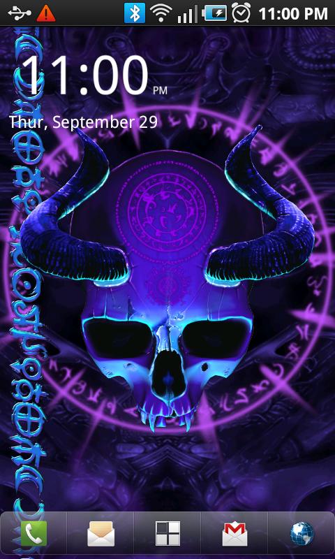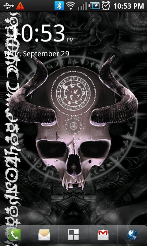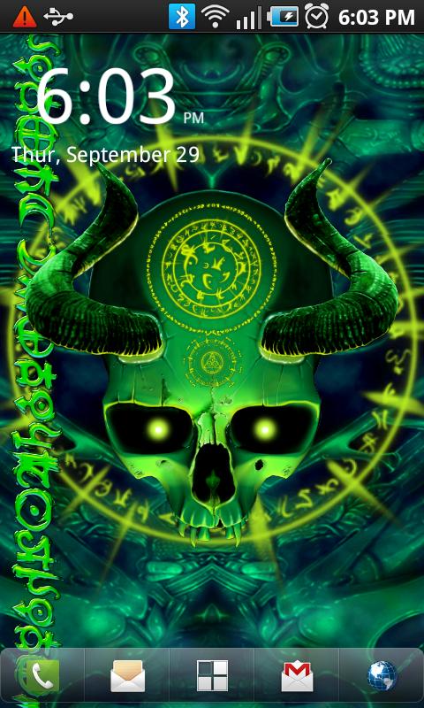 Мистические Череп Live Wallpaper с туманом, руны и анимации и прокрутки эффекты через темные биомеханических фоне. Для любителей оккультных, биомеханика, ужас, черепа, темнота.