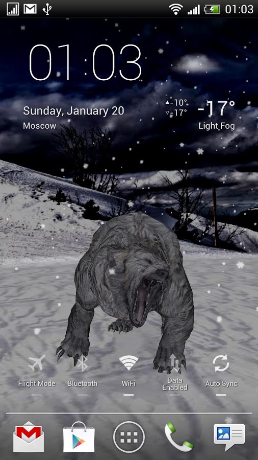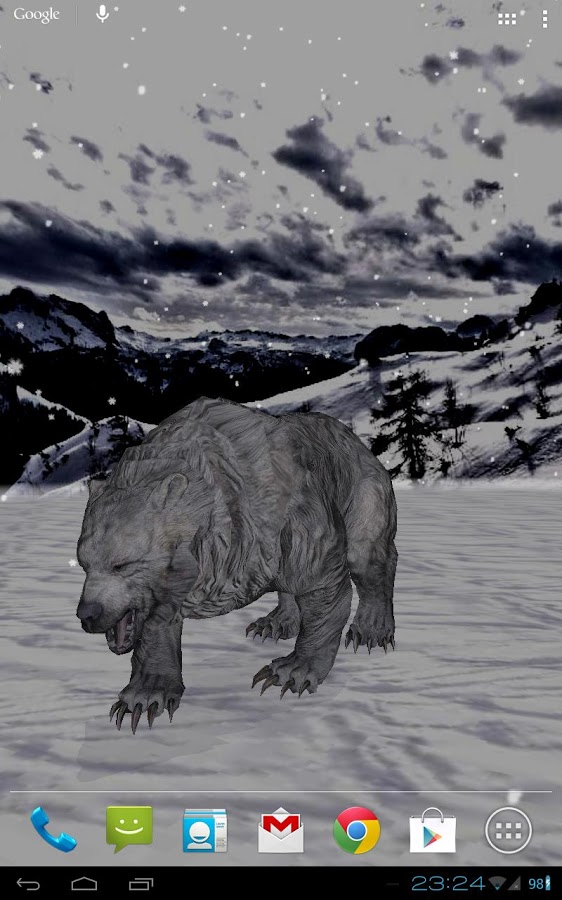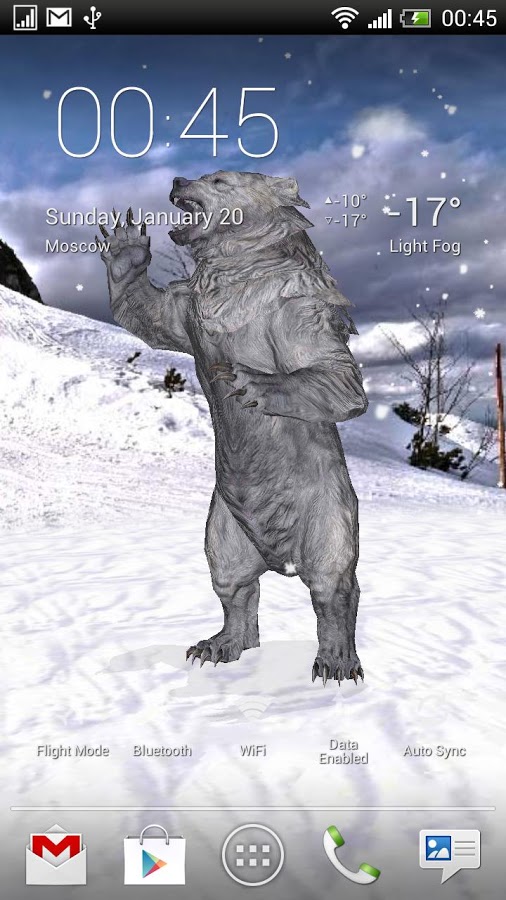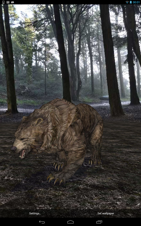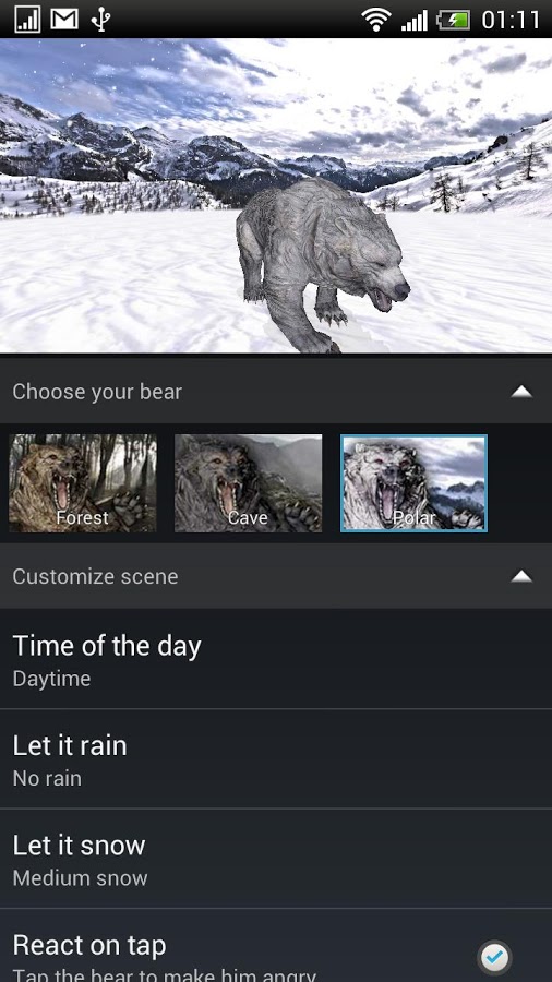 Интерактивные живые обои с настоящим медведем в его естественной среде обитания. Выбирай между лесом, горами и северным полюсом, дождливой и снежной погодой, дневным и ночным временем суток (для автоматической смены дня/ночи необходимо включить Службу Местоположения Google).