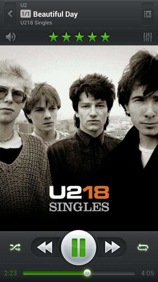* Выбор 5 различных ВИДЖЕТОВ домашнего экрана (4x1, 2x2, 3x3, 4x4, 4x2). Все виджеты являются настраиваемыми: доступно 6 различных СКИНОВ, возможность отображения фото артиста вместо обложки альбомов, возможность отображения рейтингов, контроль случайного/повторного воспроизведения и т.д.