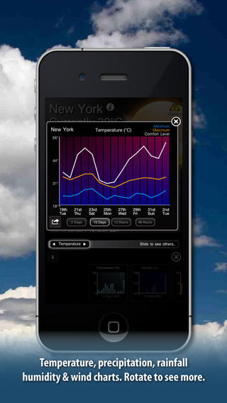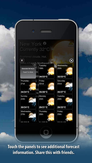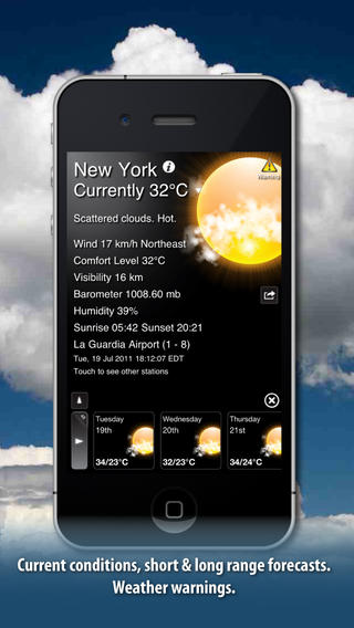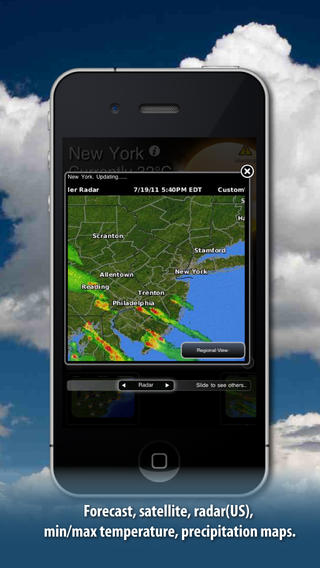 Есть отображение температуры в Цельсиях, двухдневный (ближайшие 24 и 48 часов) и пятидневный прогноз погоды, а так же погода на текущий момент времени. Так же есть метеообзор со спутника.
