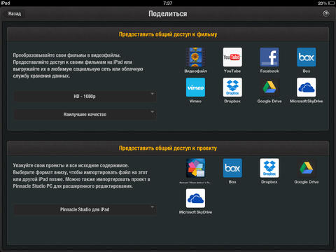 - Доступ к медиафайлам из служб Box, Vimeo, Dropbox, Google Drive и Microsoft Skydrive (покупка из приложения)