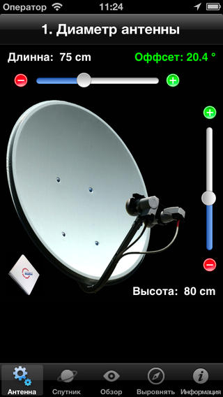 1) Установите в программе тип спутниковой антенны, а также точные размеры ее высоты и ширины