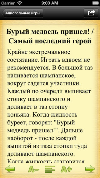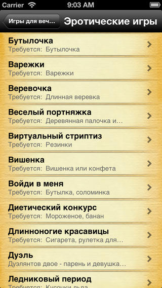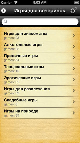 * 8 категорий игр (алкогольные, эротические, для знакомства, для развлечения, танцевальные, свадебные, приличные, на природе)