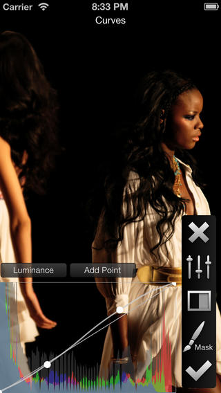 Инструменты Filterstorm Pro для редактирования не имеет себе равных для IPad. Из стандартных инструментов - обрезка, поворот и выпрямление, более мощные кривые, точки белого, черно-белые (с RGB каналом смешивания) инструменты. Истинная сила проявляется с инструментами маскирования. Вы можете применять фильтры, такие как B & W или кривые для конкретных областей изображения с помощью кисти, градиенты, виньетирование, и выбор спектра цвета.