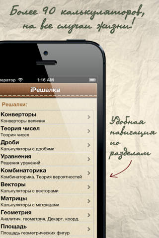 iРешалка - это подборка калькуляторов для решения математических задач. Программы детально расписывают ход решения задач, что позволяет не только получить результат, но и научиться решать математические задачи, найти и исправить ошибки в своем решении или проверить правильность своего решения.