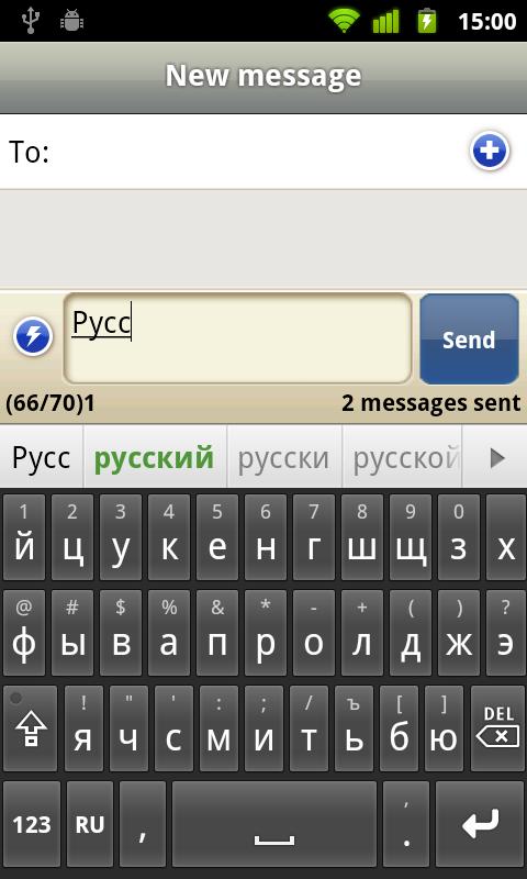 Поддержка многих языков: english, french, spanish и русский и др. Есть несколько разных скинов. Долгое нажатие на "123" вызывает меню настроек.