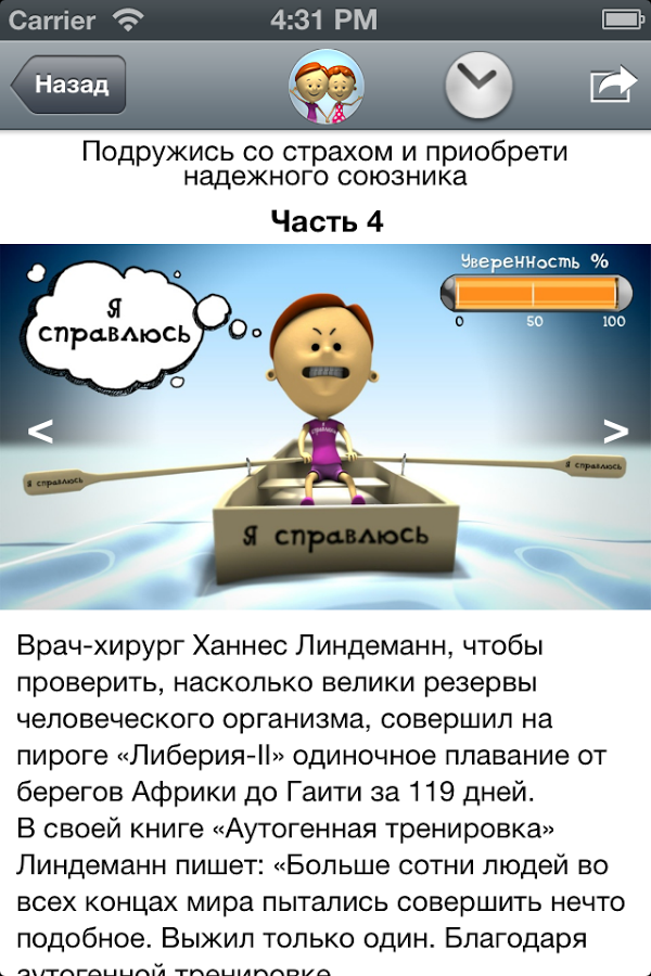 Приложение «Force&Motion» создано для тех, кто намерен получать больше радости от жизни и не позволить страху преградить путь к счастью. Регулярная самостоятельная практика с помощью «Force&Motion» позволит вам шаг за шагом продвигаться к исполнению желаний, преодолевая страхи и сомнения. Ни восхищение психологическими практиками, ни пренебрежение ими не приносят пользы. Лучшее отношение к обучающим курсам – нейтральное, как к гантелям или зубной щетке – инструментам, позволяющим решать проблемы повседневной жизни. Психологические практики должны и могут войти в повседневную жизнь как чистка зубов или утренняя гимнастика.
