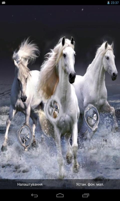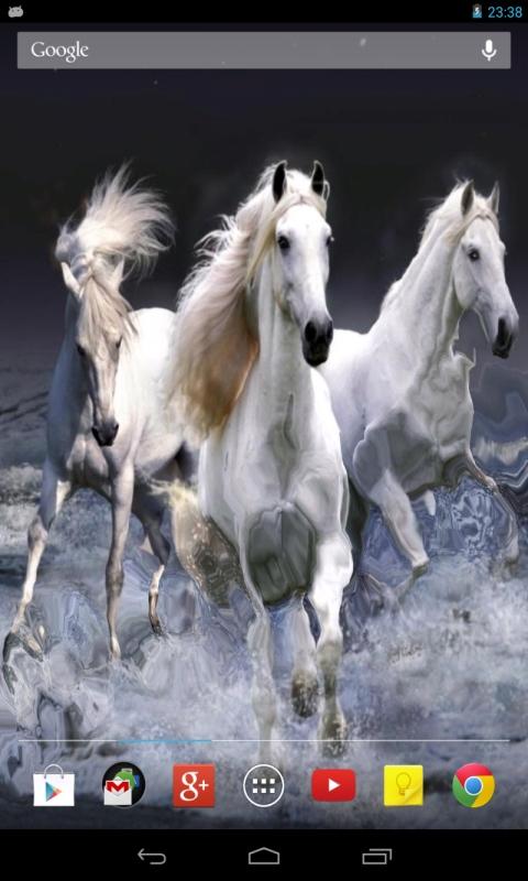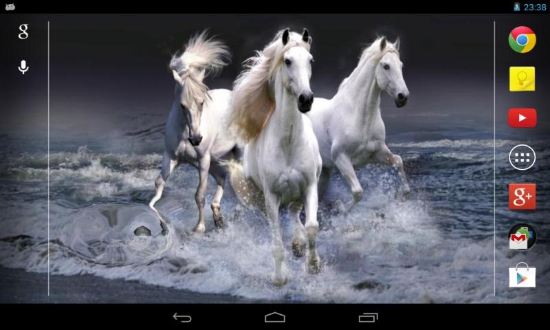Живые обои с белоснежными скакунами, бегущими по воде. Капли воды будут попадать на экран вашего устройства, а если вы прикоснетесь к нему, то по экрану пойдут волны.