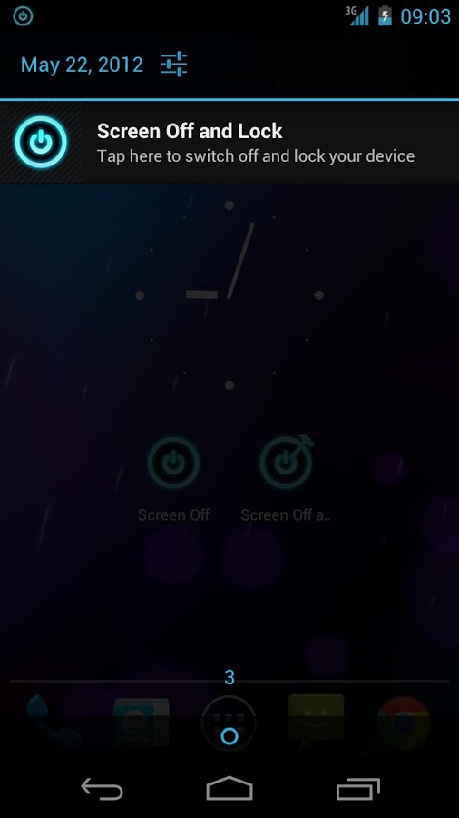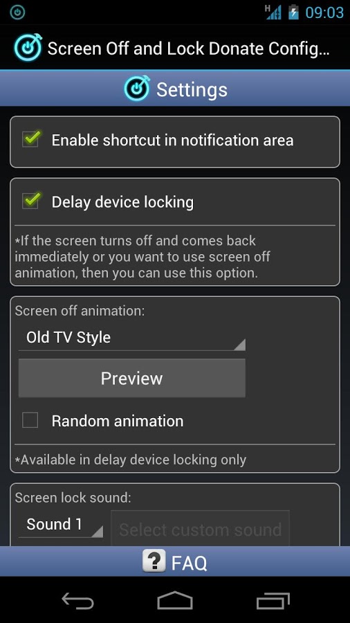 Блокировка телефона осуществляется нажатием ярлыка Screen Off and Lock, настройки программы доступны из Configure Screen Off and Lock. Есть возможность вставить ярлык программы в область уведомлений. Присутствуют различные видео эффекты при блокировке и выбор звука.