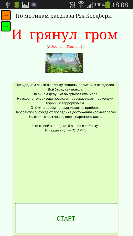 Короткий юмористический интерактивный рассказ по мотивам произведения Рэя Бредбери "И грянул гром" Что, если во время путешествия в прошлое Вы нечаянно раздавили бабочку? Оторвали хвост ящерице? Сломали дерево? Возвращайтесь в будущее. Там узнаете...