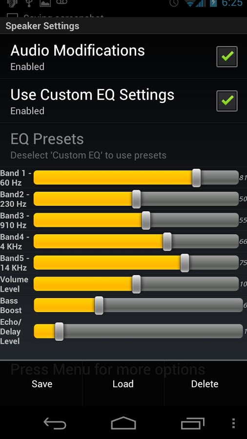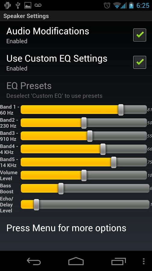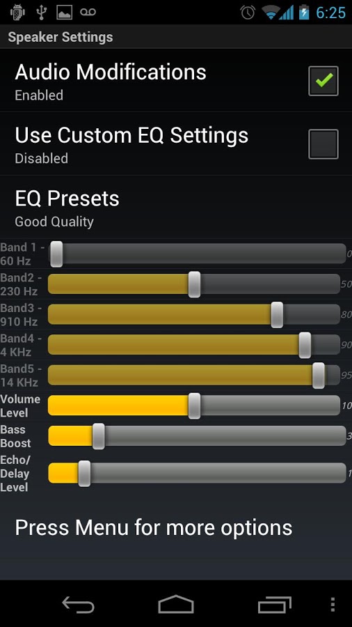 Программа дает возможность увеличить громкость и частоты звука на динамике, наушниках и блютуз гарнитуре.