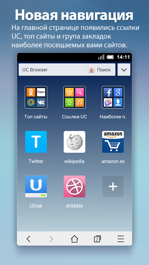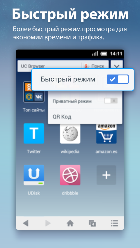 UC Browser Mini основан на классической, разработанной нами технологии U2 Kernel, созданной специально для любителей UC Browser 8.9 для Андроид. С быстрой и плавной работой на телефонах Андроид, UC Browser Mini отлично подходит для просмотра видео онлайн. Менеджер загрузок, представленный в браузере, позволяет вам быстрым и умным способом, скачать видео и музыку, а также удобно управлять файлами на своем телефоне. Если вы хотите быстрого и легкого интернета, UC Browser Mini будет лучшим браузером для вас.
