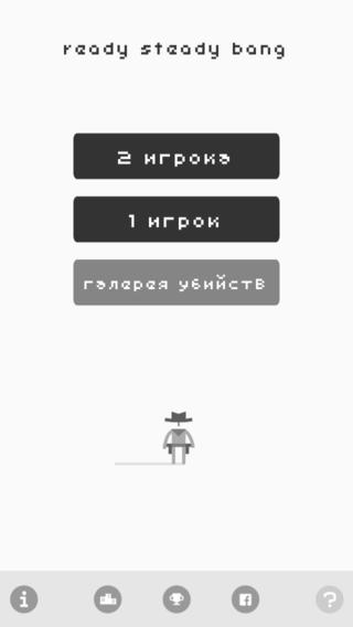 Ready Steady Bang — интересная и простая аркада о ковбоях и их непростой жизни. Графика в стиле минимал, на белом фоне отображены лишь два маленьких пиксельных ковбоя и ничего более. Персонажи хорошо анимированы и забавно «умирают» в зависимости от того, куда вы попадете (все абсолютно случайно).