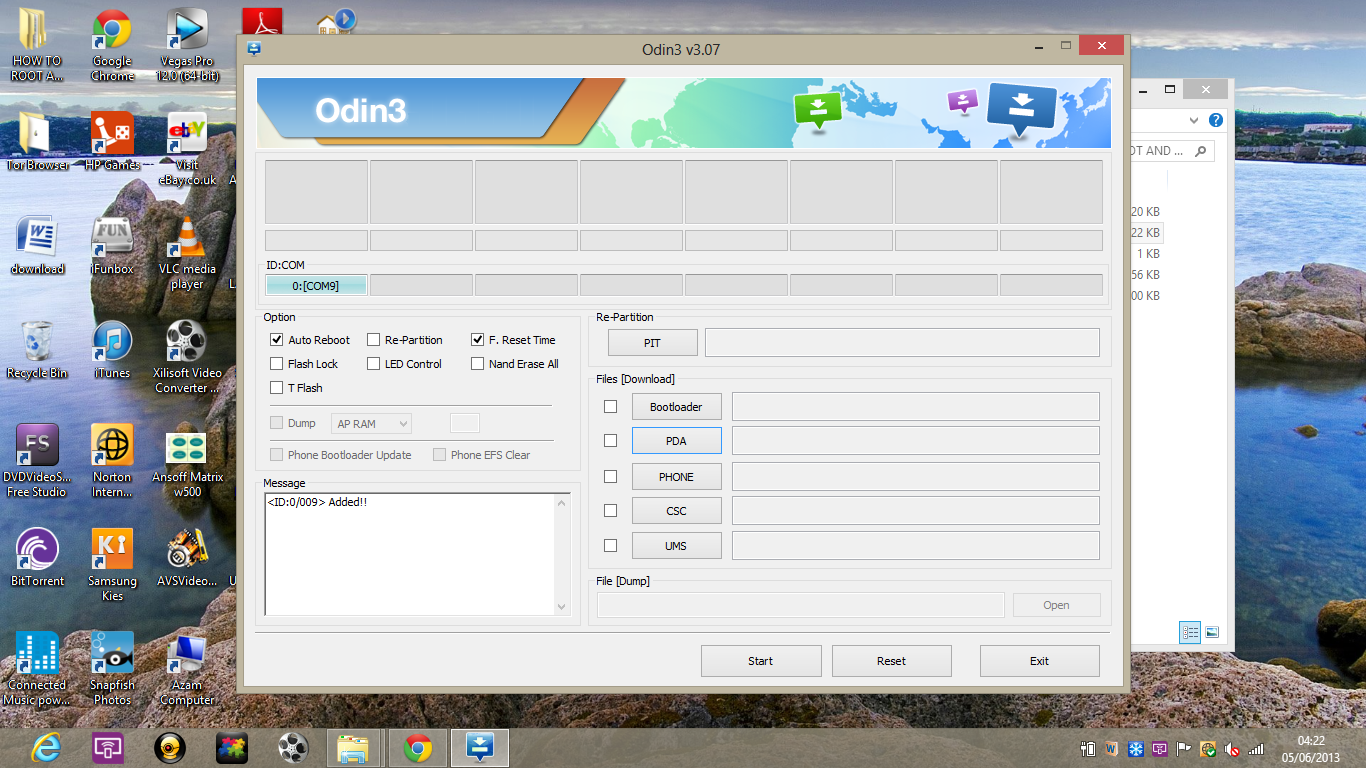 5. После того как нужный файл выбран, возьмите свой телефон в руки (не отключая от USB естественно) и приготовьтесь зажать три клавиши на нём одновременно: ПИТАНИЕ + КНОПКА ДОМОЙ + ЗВУК ВВЕРХ, но не сейчас, а после того как нажмете в Odin кнопку Start.