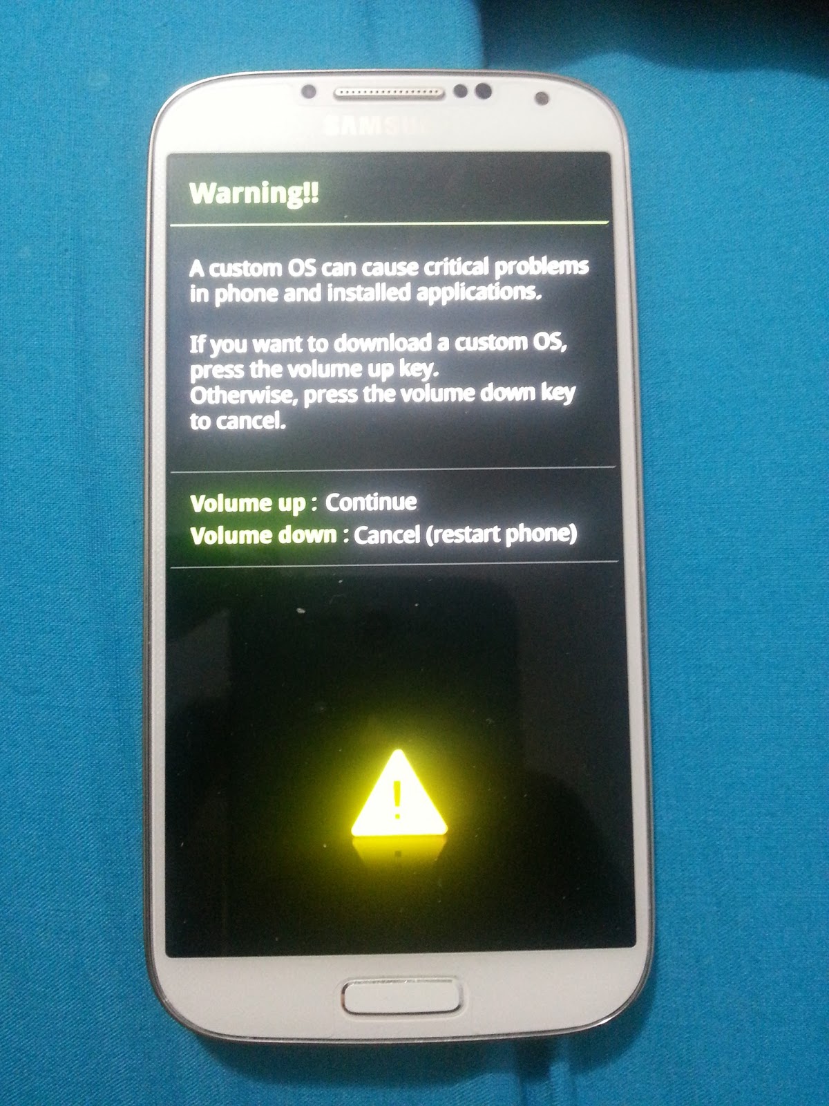 1. Загрузите ваш Galaxy S4 mini в Download mode. Для этого, полностью выключите аппарат (отключите от USB если включен), зажмите и удерживайте одновременно три клавиши Звук вниз + Питание + Домой пока не появится меню выбора режима Download, в этом меню для выбора нажмите кнопку звук вверх (Volume up: Continue) и вы загрузитесь в Download mode (скриншот ниже).