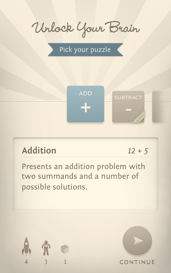 Unlock Your Brain - это замечательный инструмент для ежедневных тренировок быстроты и точности мышления. Реши короткое математическое задание для разблокировки своего телефона, упражняйся в математике легко и непринужденно, используй более эффективно для себя две секунды, которые ты обычно тратишь на разблокировку, уровень сложности заданий повышается в зависимости от твоих успехов, в отделе статистики тебе доступна вся важная информация о твоих тренировках и успехах.
