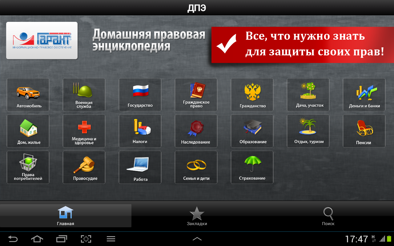 В жизни каждого человека неизбежно возникают различные правовые проблемы и вопросы. Именно для их решения мы разработали приложение «Домашняя правовая энциклопедия». Приложение «Домашняя правовая энциклопедия» от компании «Гарант» — уникальный по своему наполнению продукт. Семья, дети, образование, служба в армии, составление и расторжение различных договоров — лишь немногие темы, которые охватывает энциклопедия.