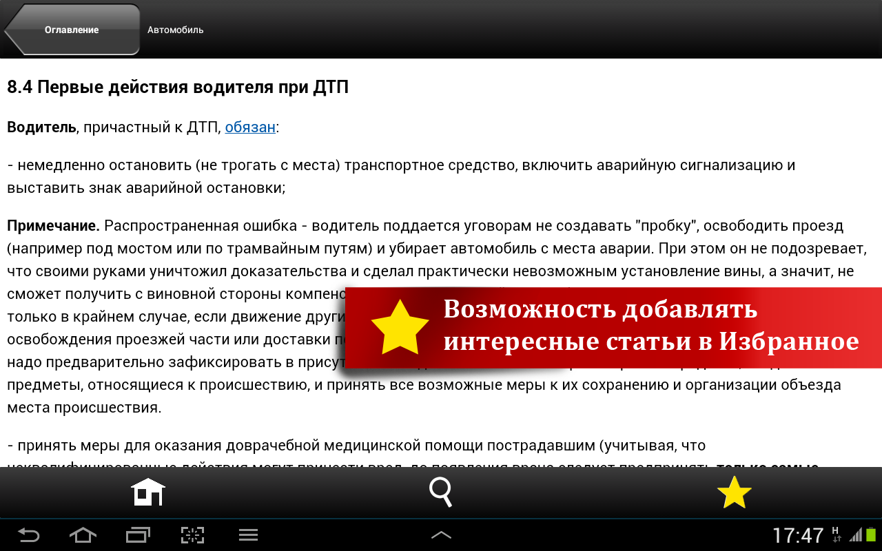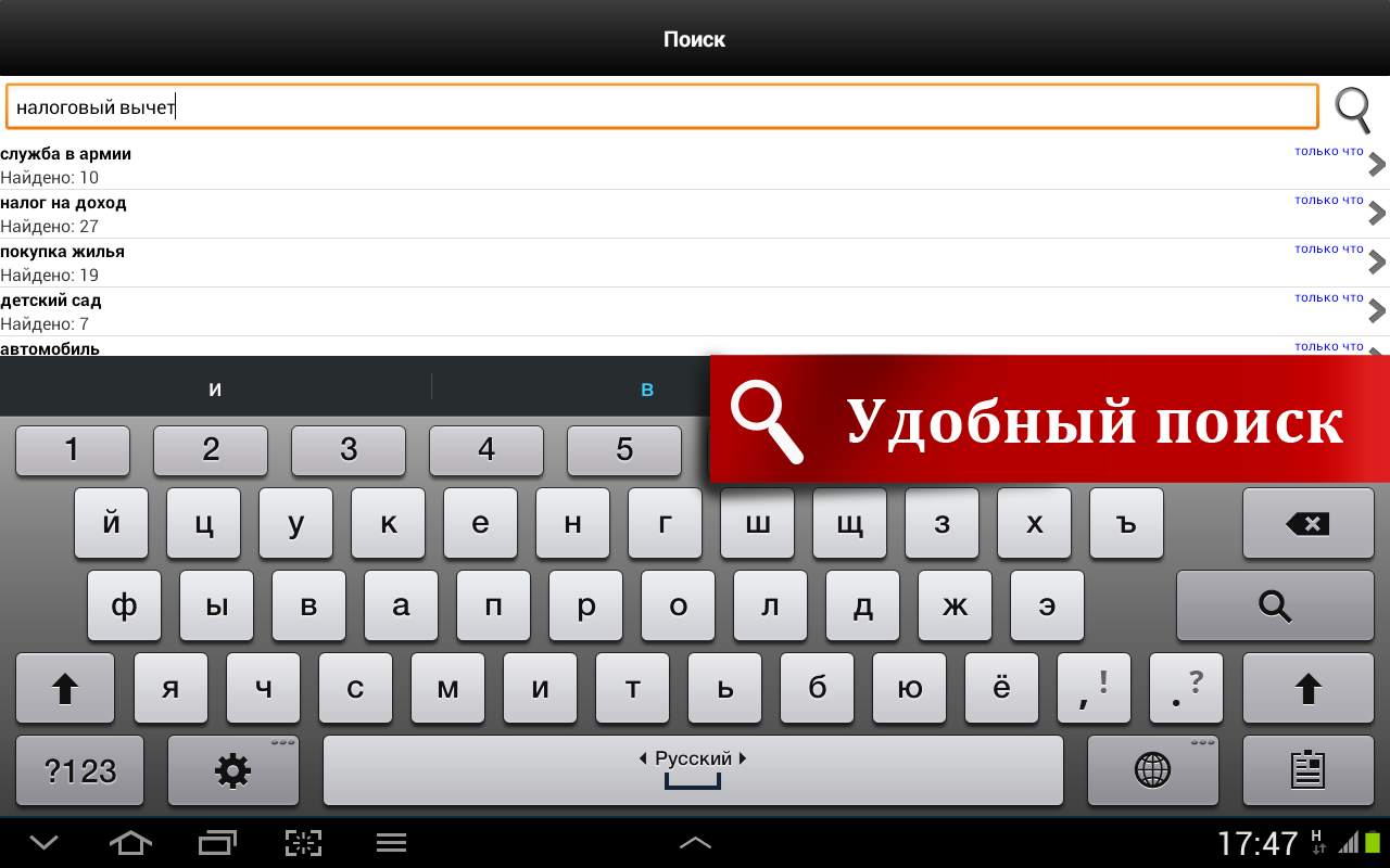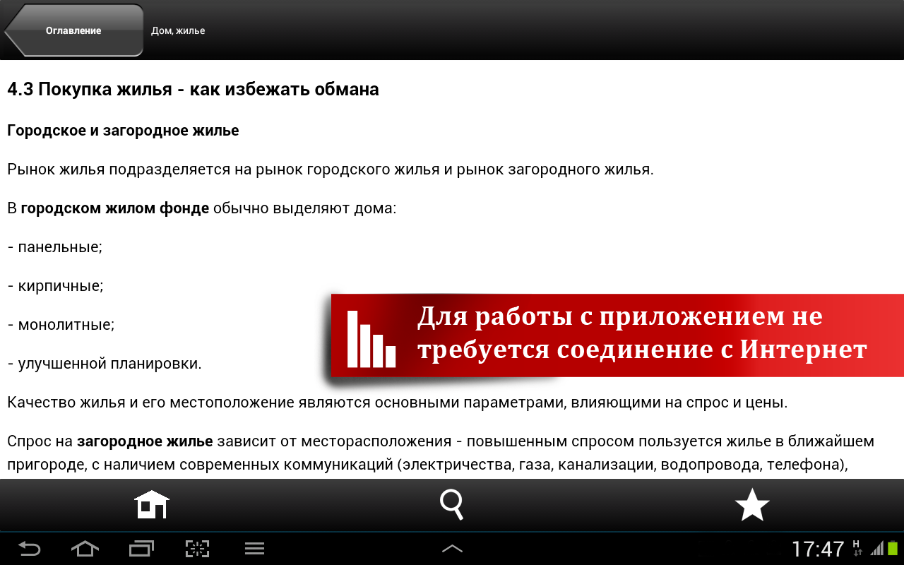 Для работы приложения не требуется постоянный доступ к сети Интернет, а обновление можно быстро загрузить, когда у вас появится такая потребность и возможность. Ориентироваться в материалах «Домашней правовой энциклопедии» просто – тематический рубрикатор позволяет быстро и удобно находить необходимую информацию, изучать смежные темы. Сквозной контекстный поиск поможет найти упоминание нужного вам понятия или контекста во всей энциклопедии. А любой интересный вам материал вы можете сохранить в «избранное».