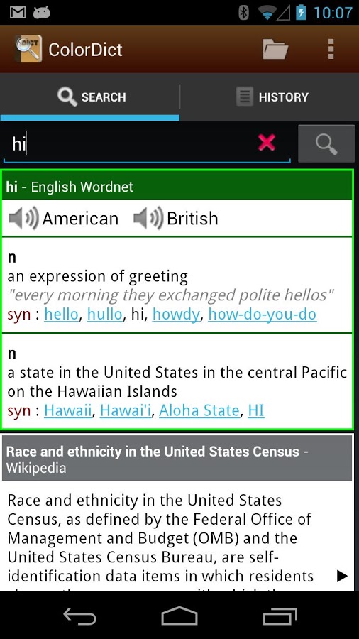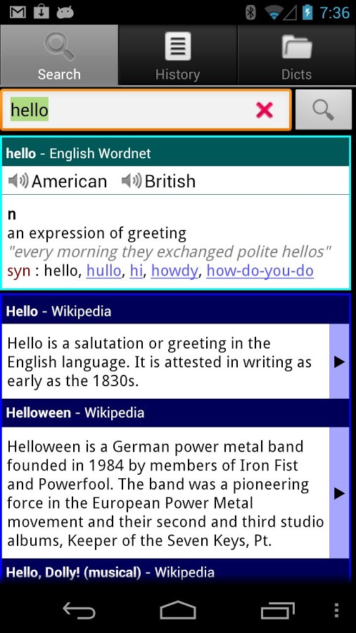 Оффлайн словари. Поддерживает формат StarDict. Позволяет вести поиск по множеству словарей сразу. История поиска, гибкие настройки, подключение/отключение словарей. Поиск по википедии и использование google translate