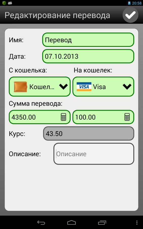 - Возможность добавлять, редактировать и удалять операции по кошелькам: доходы, расходы, переводы