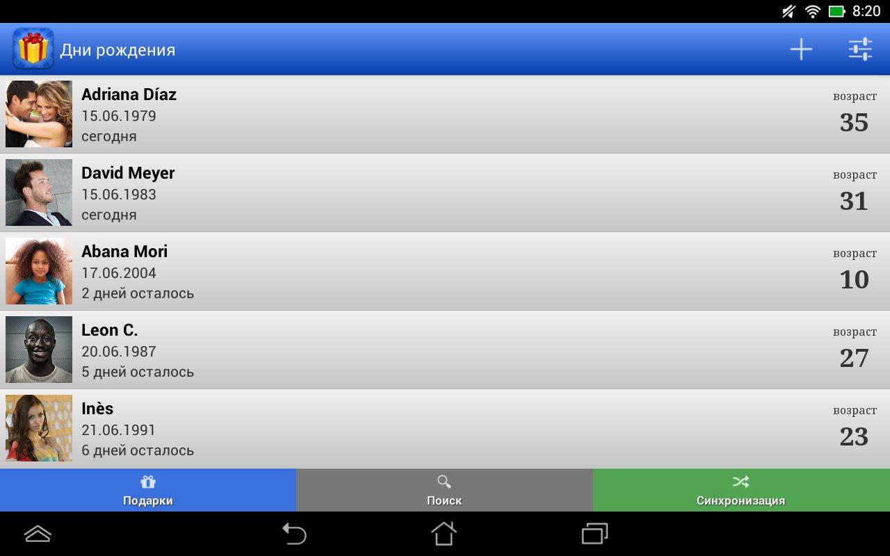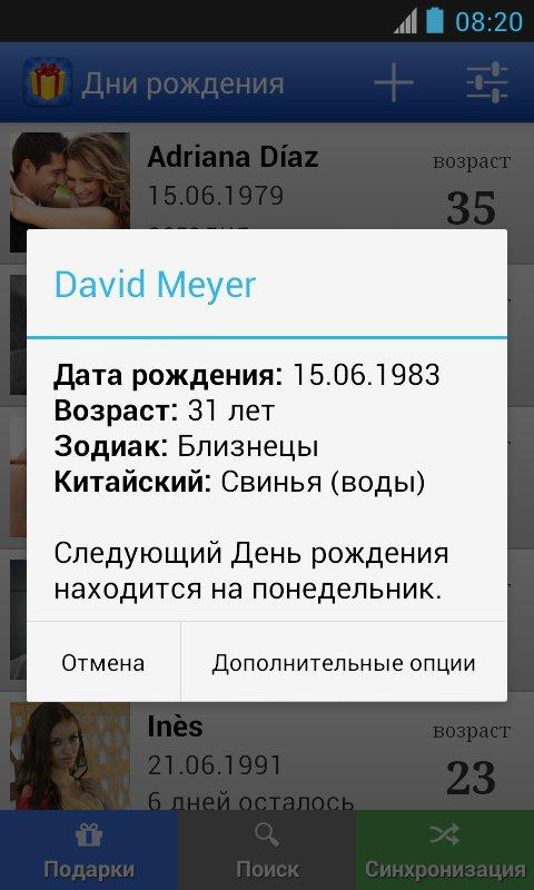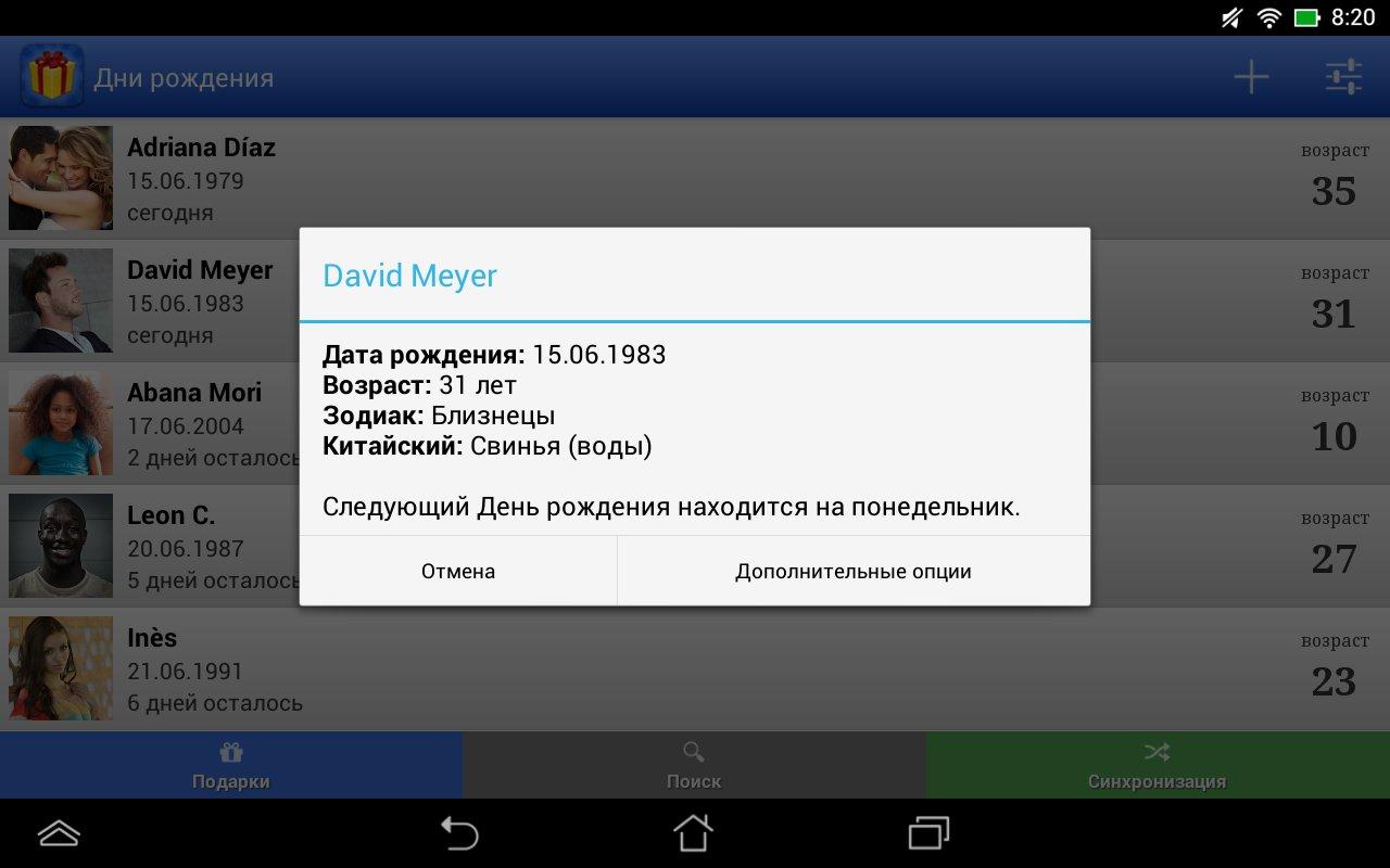 - Интернет доступ: для импорта дней рождения из Facebook или поиска классных подарков в Интернете