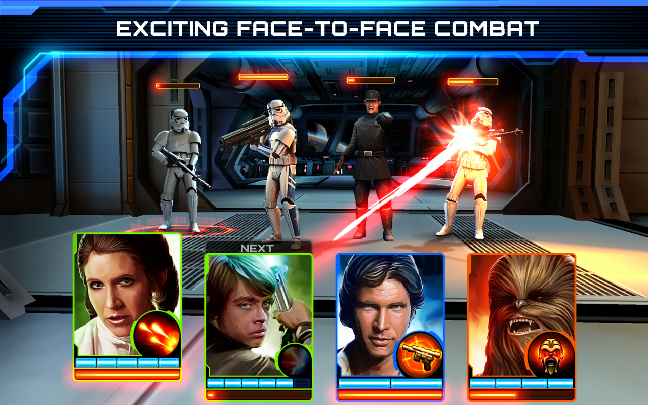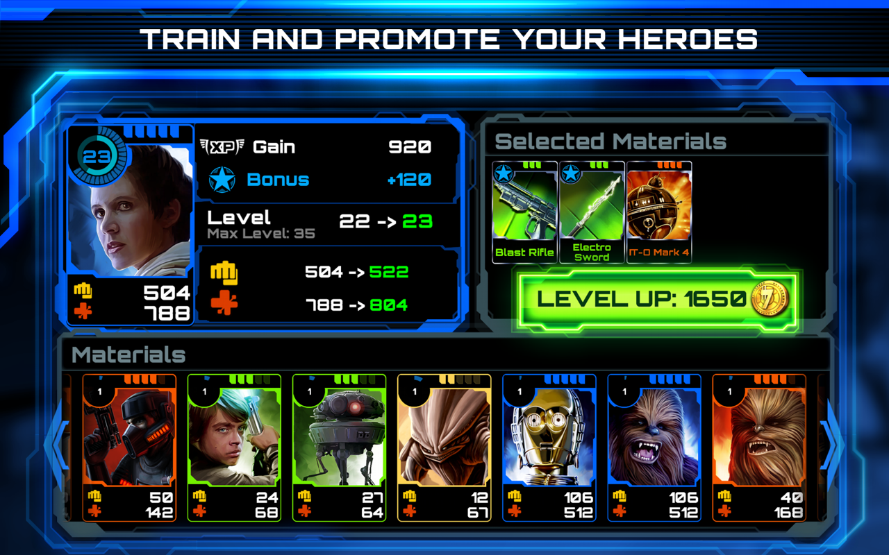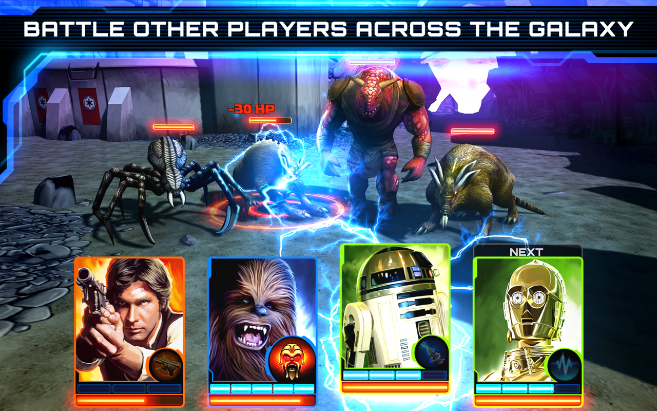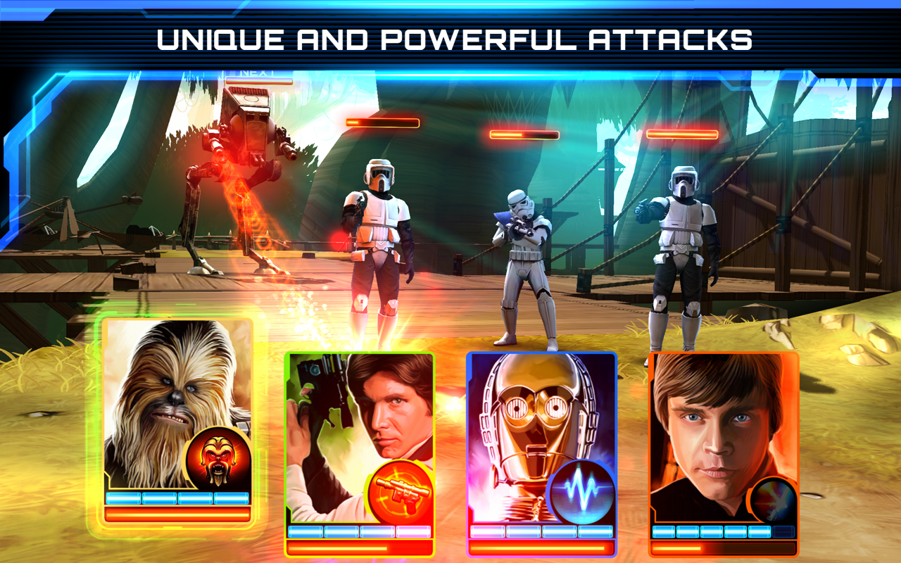 - Создайте свою собственную штурмовую группу: Соберите и играйте с вашими любимыми классическими героями Звездных Войн, такими как Люк Скайуокер, Хан Соло, Боб Фетт, Tаскен и многими другими! Каждый герой обладает уникальной статистикой, способностями и нападением, чтобы усилить боевую мощь вашей команды.
