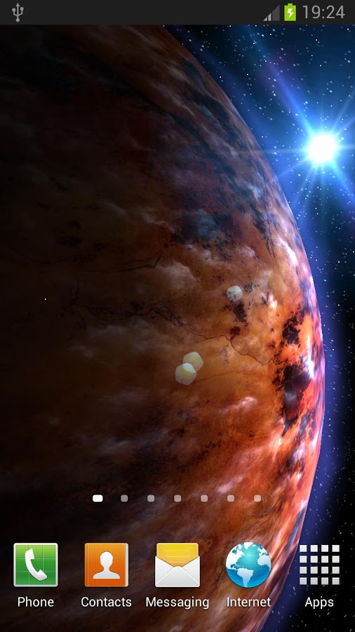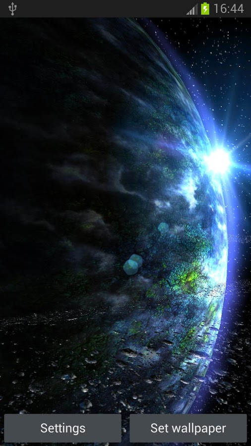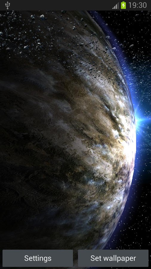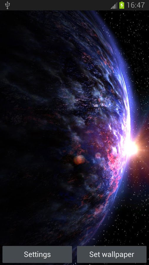 Красивые живые обои космоса на Android с большим набором планет на выбор. Приложение предлагает пользователям окунуться в просторы бескрайней вселенное и ознакомиться с некоторыми выдуманными планетами, которые не имеют названий, но вполне вероятно что существуют. Из доступных планет вы можете поставить на заставку любую понравившуюся и понаблюдать как там протекают процессы в их околосфере или атмосфере. При помощи настроек можно задавать температуру атмосферы, скорость вращения, ветра, освещения и настроить облака.