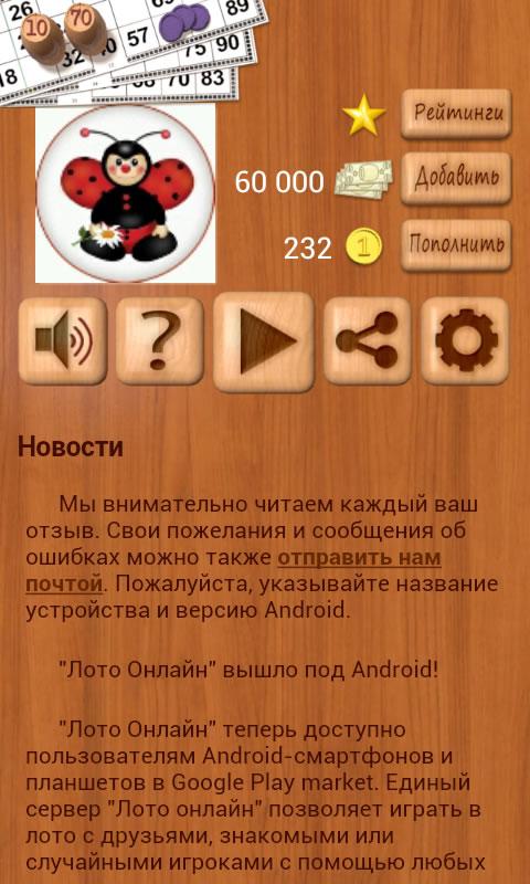 Сетевая игра в лото по классическим русским правилам. Играть могут до 6 человек. В начале игры объявляется ставка и все игроки получают по три карточки с числами от 1 до 90. В процессе игры из мешка в случайном порядке достаются бочонки с числами. Игроки закрывают число, если оно есть на карточке. Побеждает в Loto Online тот, кто первым закроет одну из своих карточек, а так же призовые места получают игроки, первыми собравшие один или два ряда на карточке.