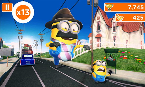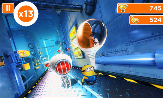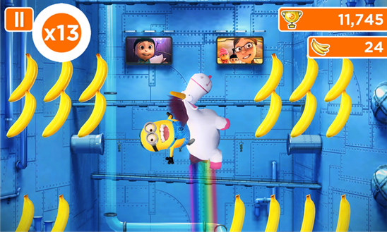 - Принимайте участие в мини-играх: Крушите все в Мега-миньоне; Собирайте бананы верхом на Плюшевом единороге; Летайте на ядерной ракете Грю