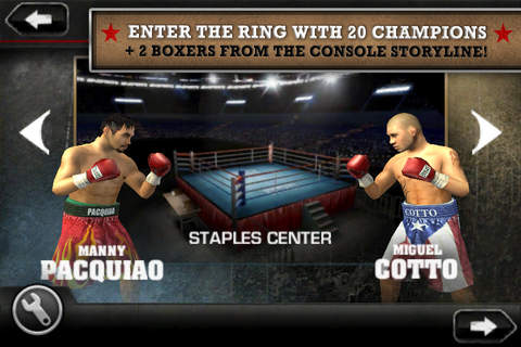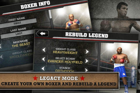 Почувствуйте себя настоящим боксёром вместе с игрой Fight Night Champion. Вам предлагается выйти на ринг с мировыми легендами бокса, такими как Дэвид Хэй, легендами бокса Майк Тайсон и Мохаммед Али. Начните на местных турнирах и развивайте ваши навыки через обучение и встречи. Станьте профи и пробейтесь на своём пути через ранги. Станьте Чемпионом! Защитите свой пояс против новых конкурентов. Со временем вы станете старше и опытнее.