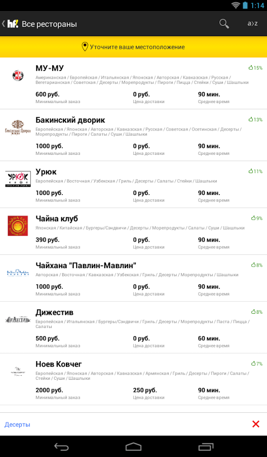 - выбор по кухне, блюду, классу ресторана, минимальной сумме заказа
