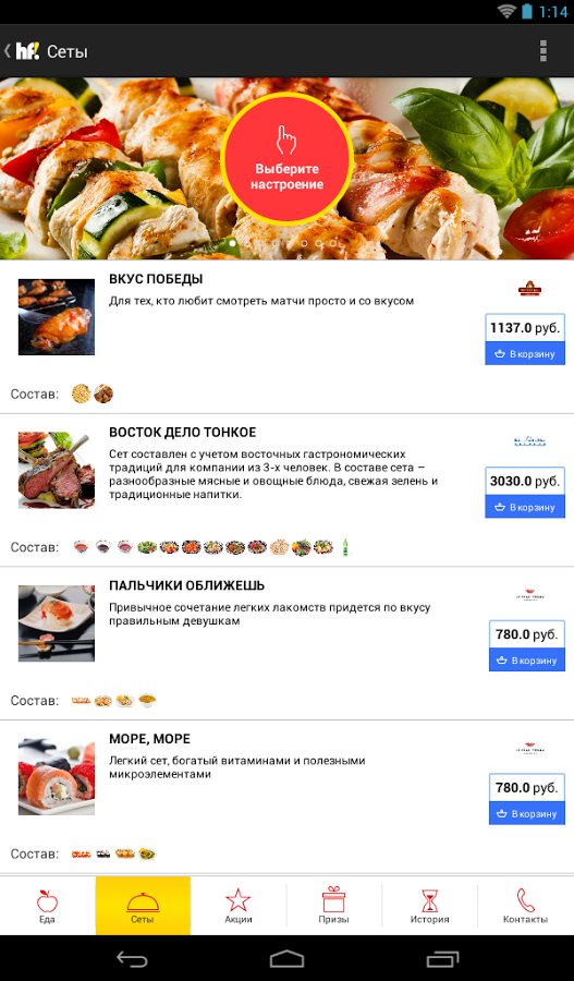 Бесплатное приложение для заказа еды из ресторанов Hitfood для Android - это быстрый и приятный способ получить вкусную еду с доставкой к Вам на дом, в Институт или на работу. При заказе блюд через приложение Hitfood Вы становитесь участником бонусной программы с великолепными подарками. А самое интересное в приложении – это полюбившиеся многим Сеты – готовые наборы блюд под различные жизненные ситуации. Романтический ужин, спортивный матч, детский праздник, девичник или мальчишник – под каждый повод уже есть вкусные Сеты. Выбирайте!