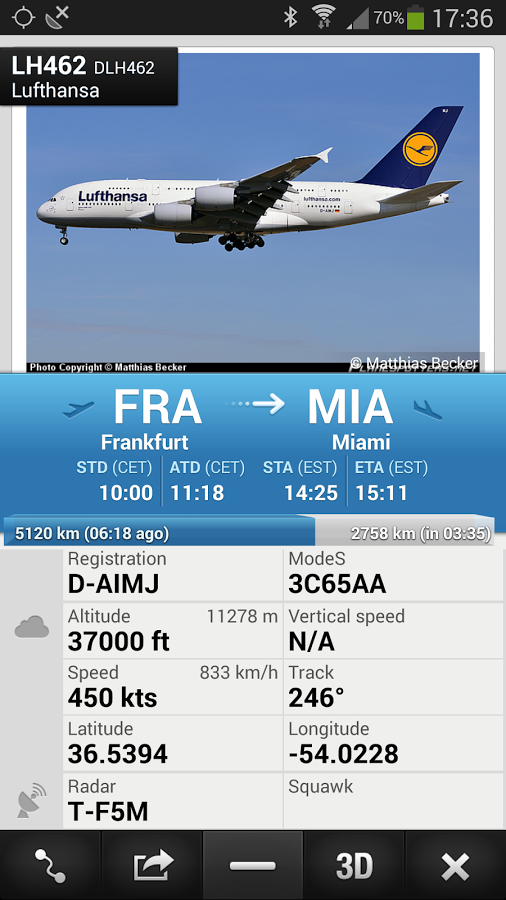 - нажмите на изображение самолёта, чтобы получить подробную информацию о полёте и самолёте, например, маршрут, предполагаемое время прибытия, фактическое время вылета, тип самолёта, скорость, высота и картинка с высоким разрешением,