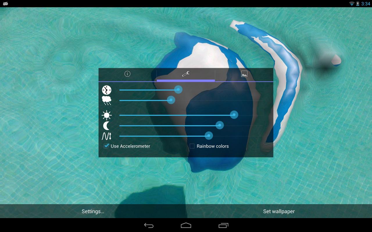 Живые обои для Android, представляющие собой интерактивную поверхность воды. В настройках вы можете установить скорость-вязкость воды, блики, тени, устроить дождик и выбрать один из 6 фонов или установить собственный, а так же многое другое.