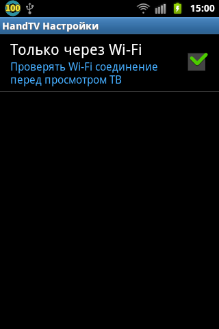 Начиная с версии 1.0.5, Вы можете использовать любое интернет соединение: Wi-Fi, WiMAX, 3G, LAN для работы HandTV. Рекомендуемая скорость соединения - от 1.5 Mbps (каналы на первой закладке - битрейт ~1Mbps, остальные каналы ~400Kbps). Отключите опцию "Только через Wi-Fi" в настройках программы для включения соответствующего режима. Чтобы попасть в окно настроек используйте кнопку "Меню" вашего устройства из главного окна приложения.
