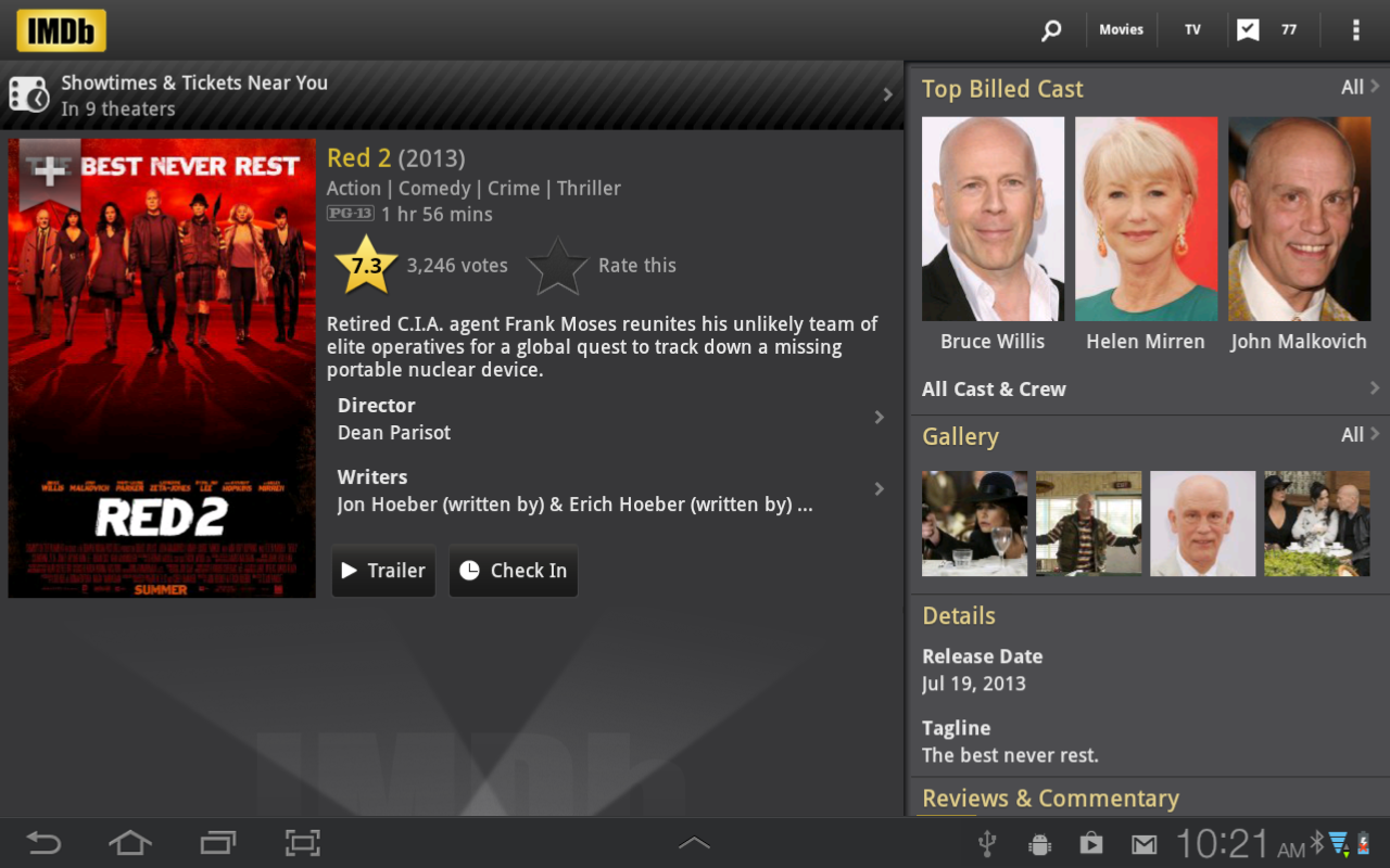 Очень удобная программа для киноманов и не только. Просмотр рейтингов, даты ближайших новинок кинопроката, актерский состав, инфо по каждому из актеров, кто и когда в каких фильмах снимался, фотографии из фильмов, с церемоний, масса другой информации.