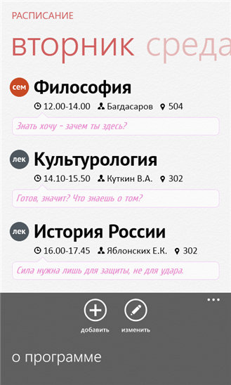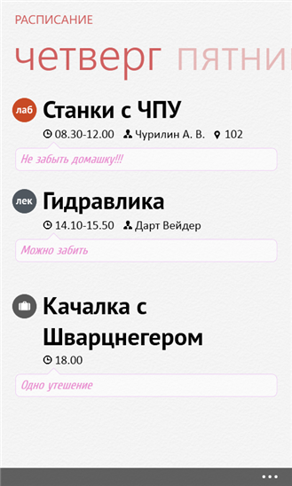 Не пропустите ни одного занятия — используйте лучшее приложение для ведения расписания на Windows Phone. Расписание позволяет удобно организовать еженедельные дела. Можно выбирать из 9 типов занятий, чтобы вы могли легко находить важные, а функция заметок пригодится, когда нужно записать быстрый комментарий к занятию.