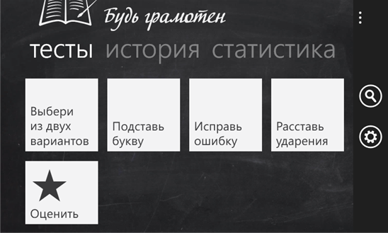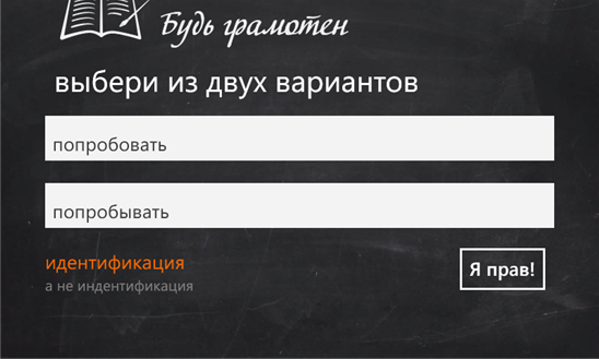 Заботитесь о своей грамотности? Простые тесты помогут запомнить написание сложных слов. «Живая плитка» будет напоминать о словах, которые даются труднее всего. Также вас будут радовать тесты на ударение, исправление ошибок, и просто выбор из двух вариантов. Вся история ответов сохраняется, и вы можете просматривать слова, в которых вы делаете ошибки и запоминать правильное написание и произношение. Тщательно отобранные и проверенные слова ждут вас в приложении.