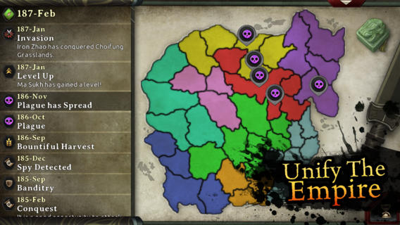 Управляйте своей империей: управляйте городами, стройте здания, поднимайте войска и участвуйте в дипломатии и шпионаже. Объедините землю, завоевывая все провинции!