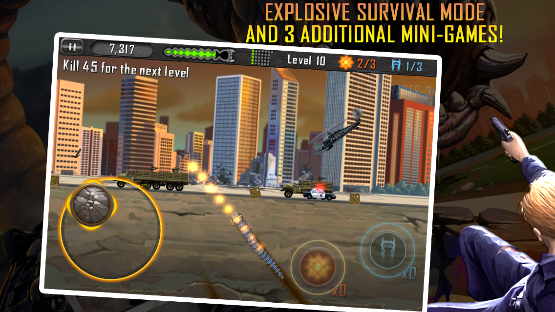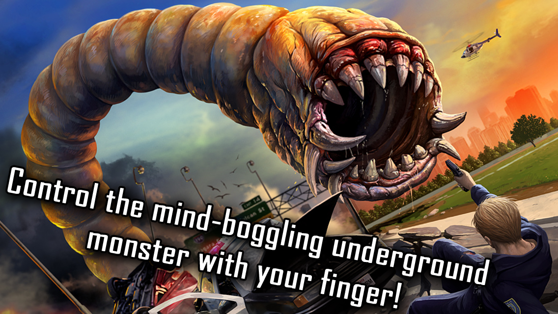 Управляйте свирепым подземным монстром при помощи всего лишь одного пальца! (О'кей - двух, если захотите выстрелить или включить супер-скорость!). Охотьтесь на людей, животных и птиц, взрывайте машины и танки, сбивайте самолеты и вертолеты, возьмите верх над армией людей и даже над пришельцами!