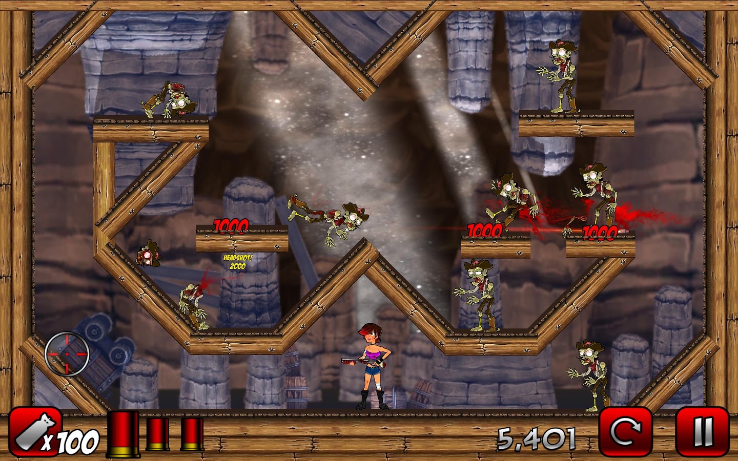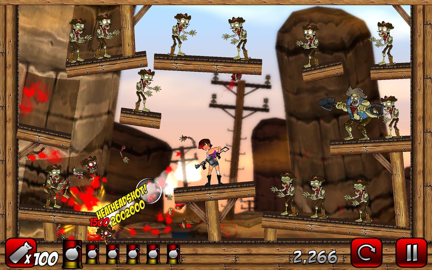 Stupid Zombies - аркадная игра, которая внешне очень напоминает знаменитые Angry Birds. Но суть игры совсем другая. Вы играете диким ковбоем, на которого пала миссия спасти эту планету он назойливых зомби, которые вернулись на землю, чтоб захватить ее. У вас есть оружие, но в нем ограниченные патроны, и чтоб убить всех зомби вам их не хватит. Поэтому вы должны использовать все предметы и элементы "декора" для того, чтобы выполнить свою нелегкую миссию.