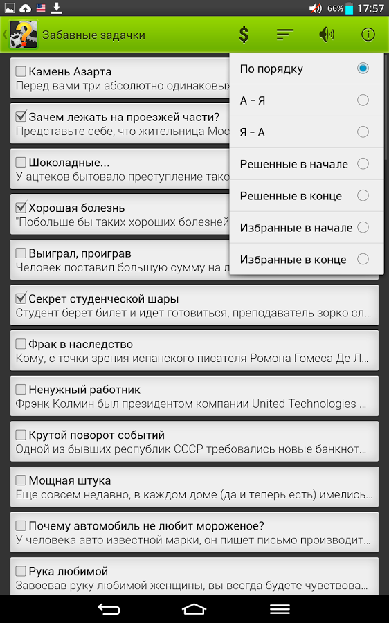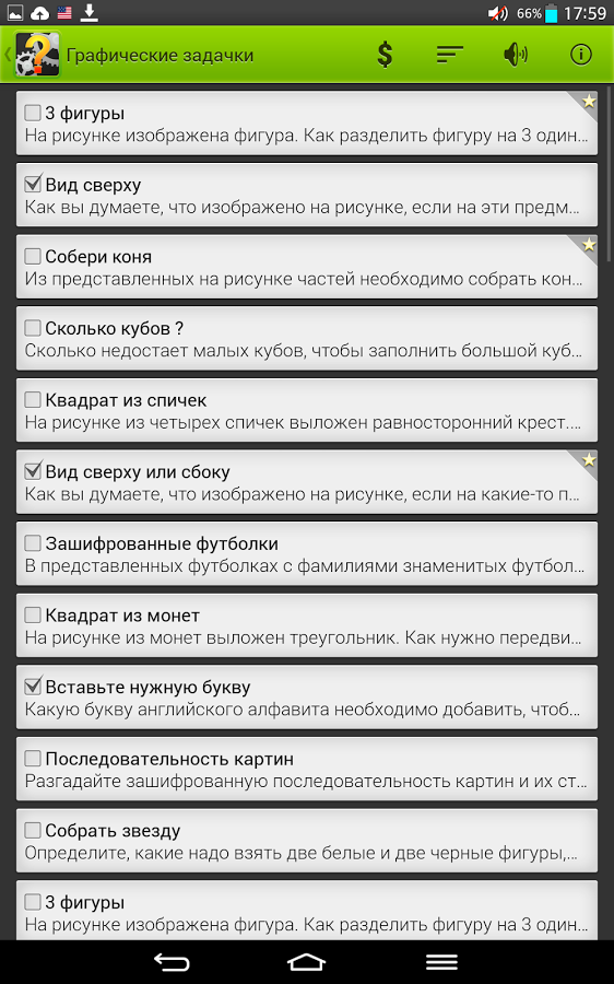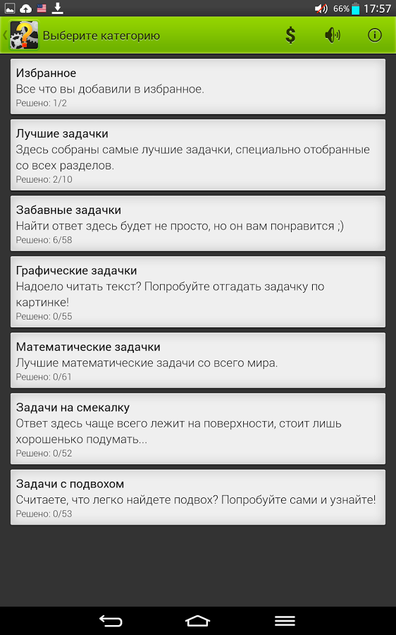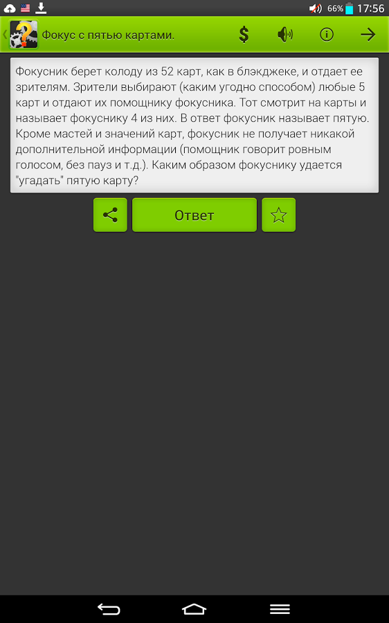 Хотите проверить свои навыки решения логических задач? Встречайте самые различные упражнения на логику, смекалку и наблюдательность. Попробуйте решить их все! В программе вы найдете занимательные логические задачи на самую разную тематику: математические, физические, исторические, задачи на смекалку, задачи-шутки и задачи с подвохом. Задачи встречаются разного уровня сложности: от тех, которые могут решить даже дети, до задач олимпиадного уровня. Вы можете также поделиться задачками со своими друзьями! Все логические задачи в программе уже с ответами. Но не торопитесь нажимать на кнопку "Ответ", поломайте голову в поисках решения и получите истинное удовольствие при совпадении вашего ответа с предложенным вариантом.
