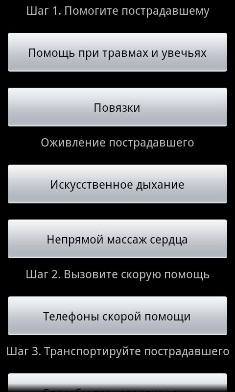 Приложение-справочник по оказанию первой медицинской помощи. Включает в себя следующие разделы: