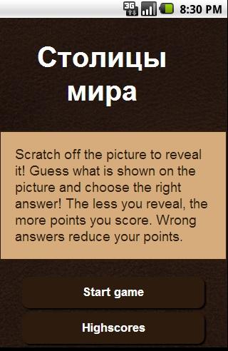Столицы мира- интересное и увлекательное игровое приложения для проверки или запоминания столиц мира. В Столицы мира вам нужно будет угадывать столицу того или иного государства, по флагу этой страны, но чтобы было интереснее играть и запоминать столицы вам придется стирать (защитный) верхний слой флага,так как он будет срыт и чем меньше вы сотрете, и угадаете столицу,тем больше у вас будет очков