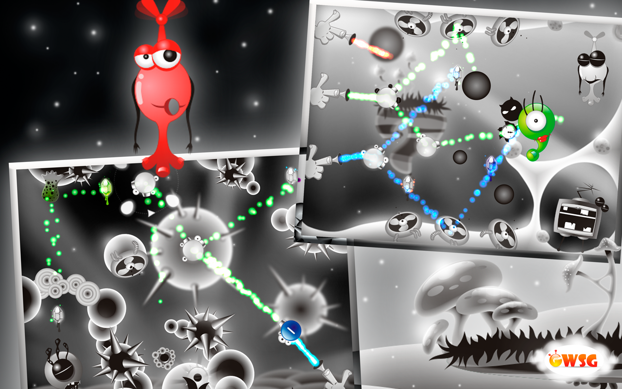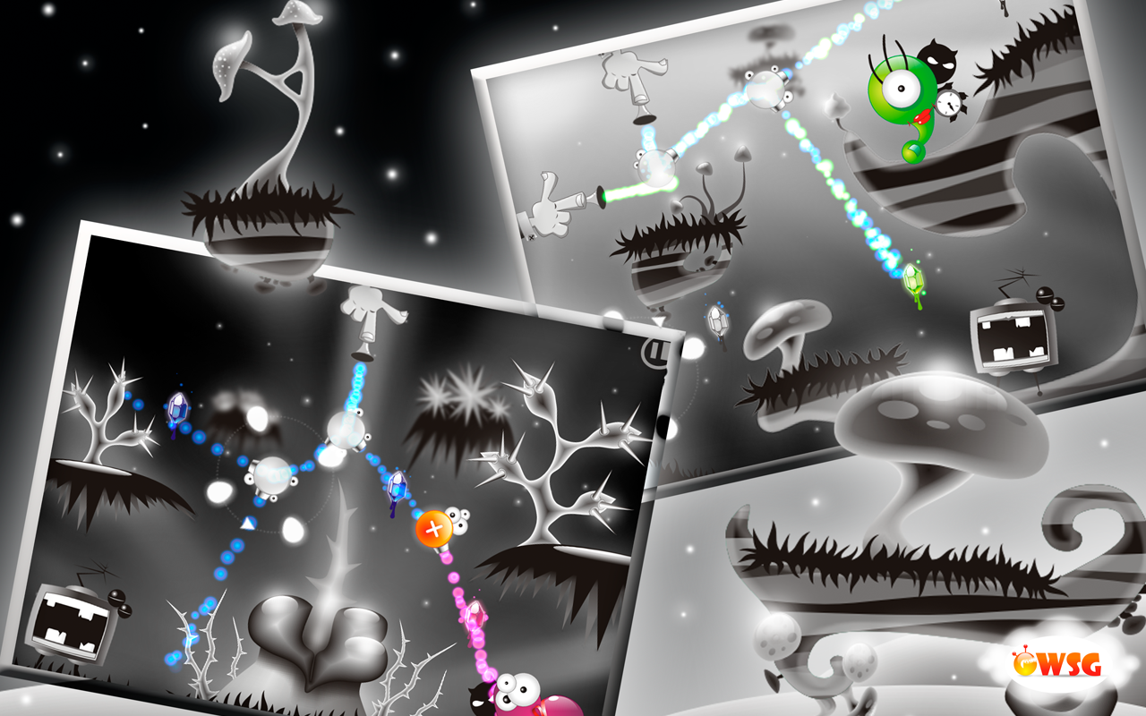 Срывайте живые растения-механизмы с кустов, передвигайте их к потокам краски, вращайте так, чтобы правильно выстроить направление потока краски к монстрику. Стройте цепочку красочного потока через кристаллы, которые понадобятся вам для того, чтобы начать раскрашивать жителей следующего города.